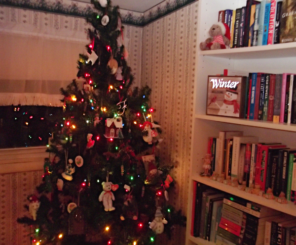 I also kinda promised a picture of my freshly decorated Christmas tree, didn’t I? As always, apologies for the picture quality (or lack thereof), but here she is! With a special appearance by one of my bookcases: