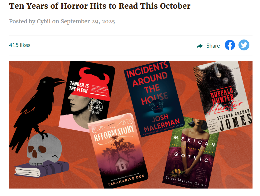 So, Goodreads releasing a “Ten Years of Horror Hits” list and making it an Achievement for the 2025 Reading Challenge has really caught my attention. I’d like to read at least one of these books per month throughout the length of the challenge. So let’s look at the list and see what I’ve read, what I own but haven’t read yet, and what I’m interested in. And then I’ll choose a little TBR!