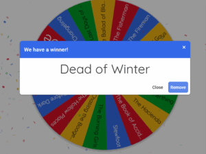 Okay, I’ve got the Wheel of Names set up with the titles I’m excited for, so I’ll screencap the before and after of my spins. Here we go…